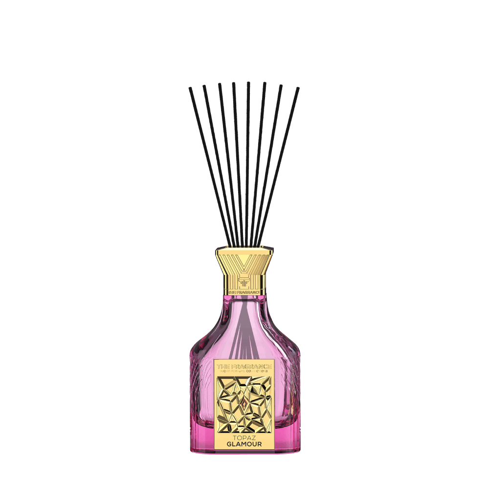T opaz Glamour is designed to reflect the glamour of youth mirroring the changing whims with its dancing notes, an audacious leap to a summer sky, and a tale of impulsive optimism surrounded by shedding uncertainty. The rare topaz gem and its energy that stir feelings and emotions is the inspiration behind bottles color and the gem at the center of the golden plate.
